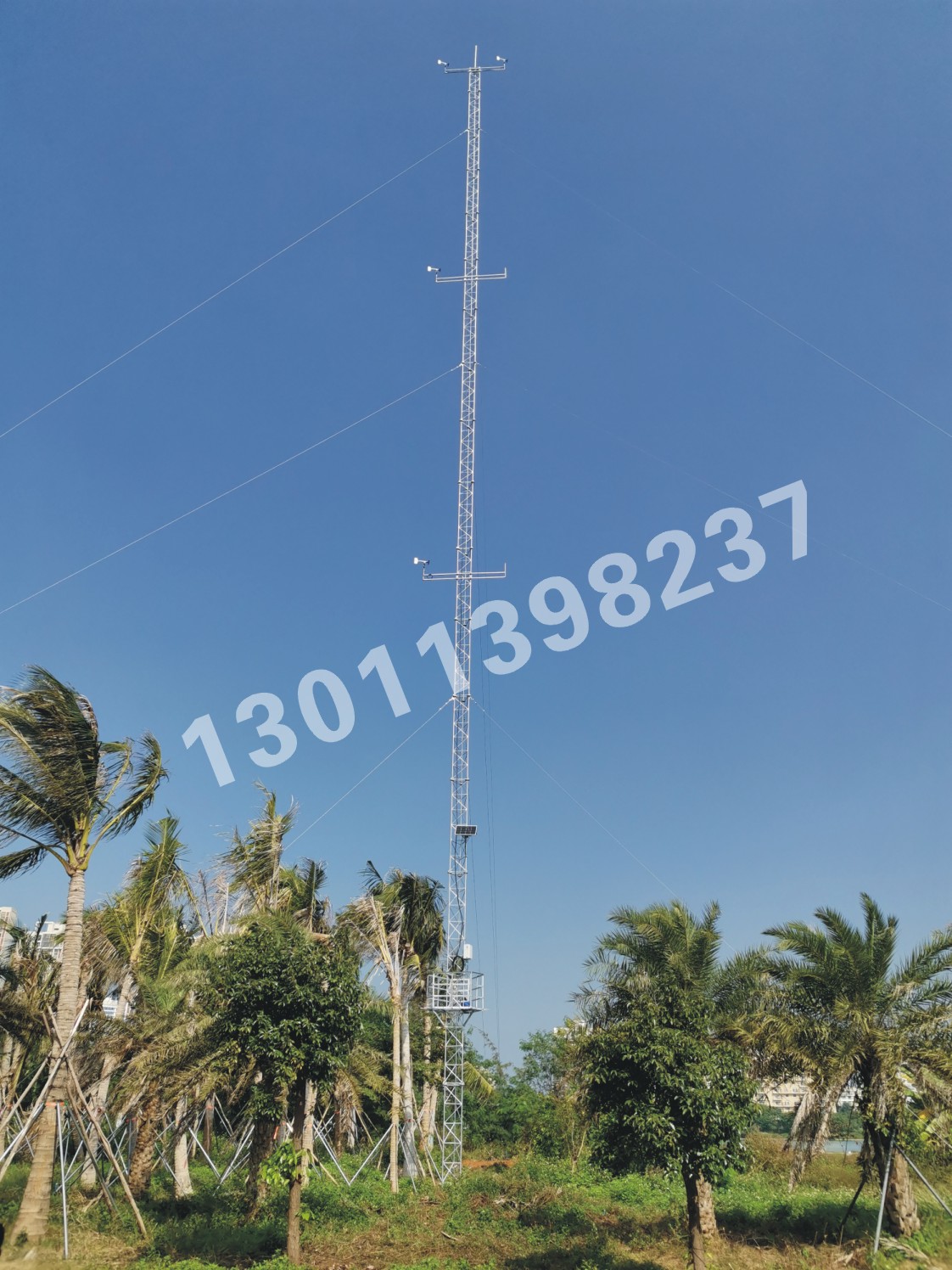 測風塔、拉線塔為早期中波塔應用的分支塔型。該塔由三柱圓鋼塔基加固鋼絞線構成。高度通常在70-90米,用途為安裝風速傳感器、風向傳感器、大氣壓傳感器、溫濕度傳感器、能見度傳感器、碳通量傳感器等設備。本塔采用模塊化設計、單節長度3~4.5米,塔體截面呈正三角形、邊寬500mm,節段之間采用法蘭螺栓連接,加固方式為φ7.8mm熱鍍鋅鋼絞線,鋼絞線垂直間隔12-15米,拉線與地面夾角30-60°。塔身設置不銹鋼設備安裝組件,安裝高度按傳感器安裝高度執行,安裝方式為定制U型抱箍連接,塔高10米處設置設備集成箱安裝及檢修平臺。平臺外圍設置防爬倒刺、平臺底部設置門鎖、用于安全防護。