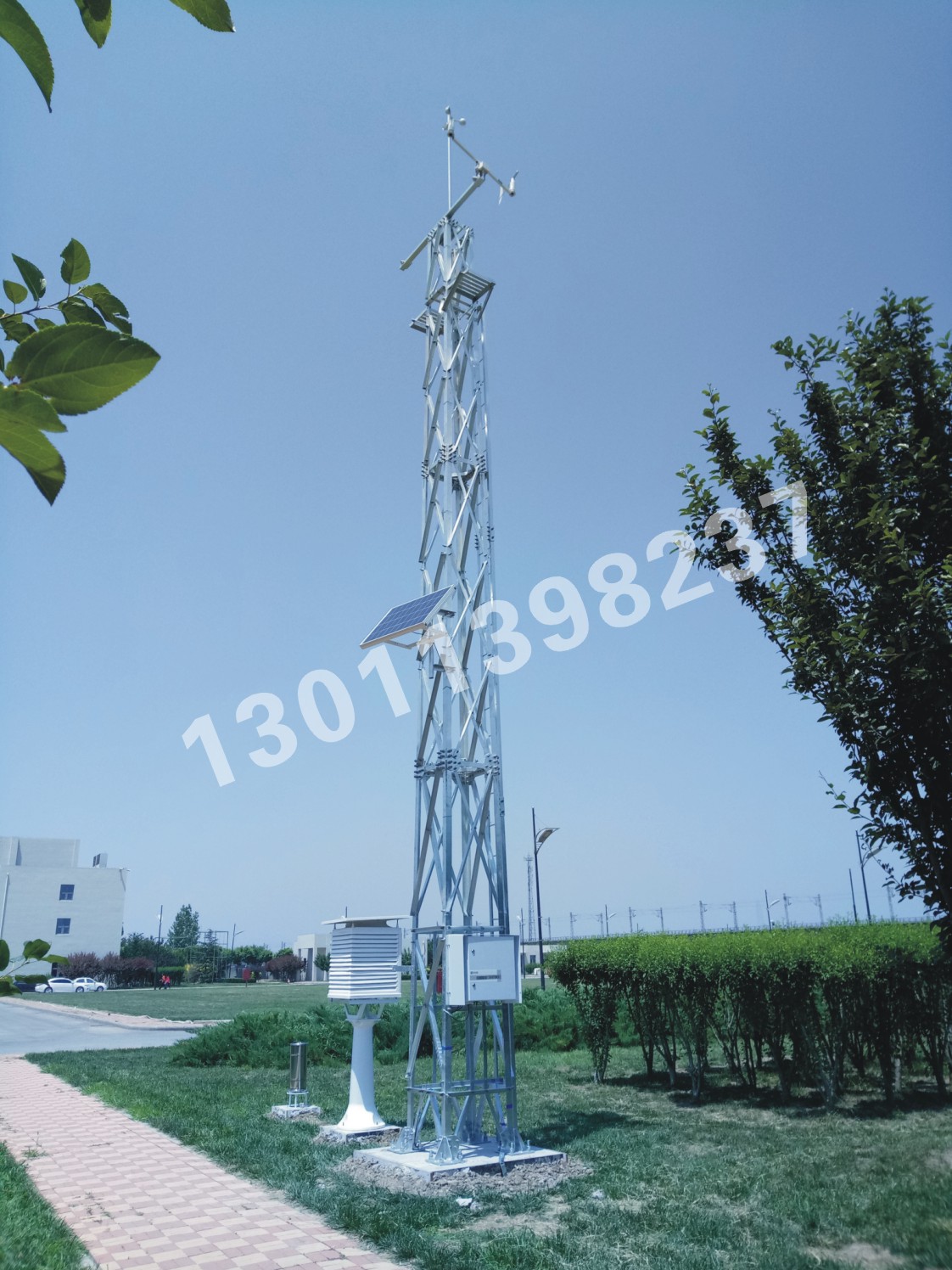測風塔、拉線塔為早期中波塔應用的分支塔型。該塔由三柱圓鋼塔基加固鋼絞線構成。高度通常在70-90米,用途為安裝風速傳感器、風向傳感器、大氣壓傳感器、溫濕度傳感器、能見度傳感器、碳通量傳感器等設備。本塔采用模塊化設計、單節長度3~4.5米,塔體截面呈正三角形、邊寬500mm,節段之間采用法蘭螺栓連接,加固方式為φ7.8mm熱鍍鋅鋼絞線,鋼絞線垂直間隔12-15米,拉線與地面夾角30-60°。塔身設置不銹鋼設備安裝組件,安裝高度按傳感器安裝高度執行,安裝方式為定制U型抱箍連接,塔高10米處設置設備集成箱安裝及檢修平臺。平臺外圍設置防爬倒刺、平臺底部設置門鎖、用于安全防護。