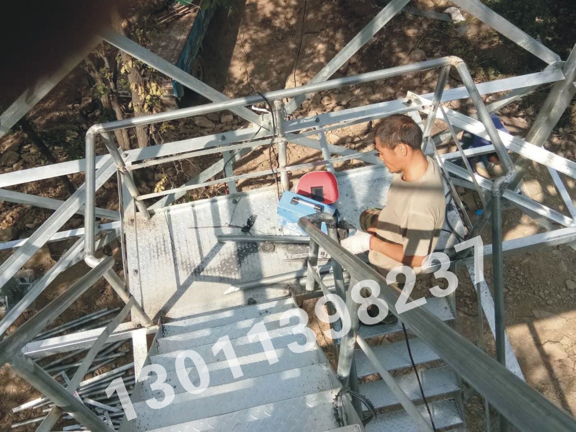 瞭望塔主要用于監(jiān)管人員登塔高空瞭望監(jiān)測(cè)使用,該塔由塔體、樓梯及瞭望崗?fù)そM成。塔體附加安裝前端視頻采集設(shè)備、無線傳輸設(shè)備及風(fēng)光供電設(shè)備,主要應(yīng)用單位為國(guó)家邊海防委員會(huì)、林草局、公安等部門。該塔為通信塔應(yīng)用的分支塔型。塔體樓梯執(zhí)行標(biāo)準(zhǔn)02J401,樓梯踏步采用扁豆型花紋板(或鋼格板),兩側(cè)扶手采用鍍鋅鋼管、樓梯兩側(cè)扶手現(xiàn)場(chǎng)焊接后采用油漆防腐處理。塔頂平臺(tái)處設(shè)置瞭望崗?fù)ぃㄒ步兴浚?、瞭望崗?fù)ね庑螢樗慕切突蛘吡切危t望亭外部為塔頂平臺(tái)四周圍欄,崗?fù)げ捎貌输搹?fù)合板或者雙層不銹鋼材料。樓梯進(jìn)出室內(nèi)部分設(shè)置出入口門鎖。