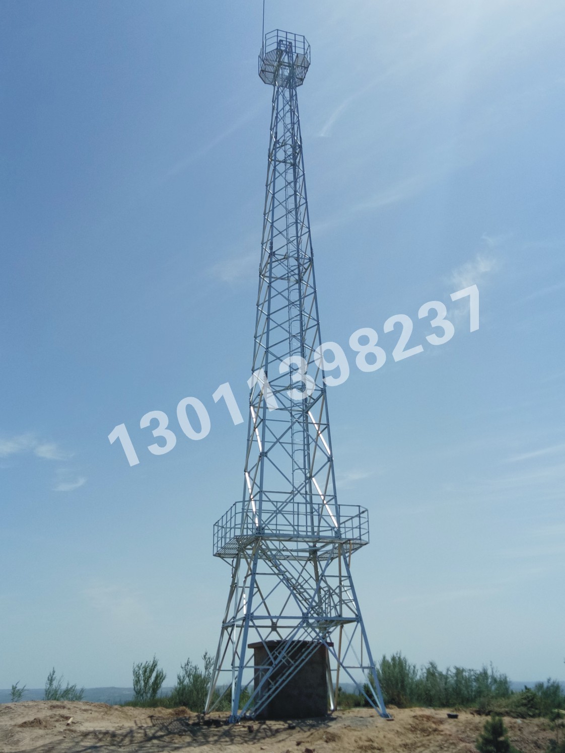 瞭望塔主要用于監管人員登塔高空瞭望監測使用,該塔由塔體、樓梯及瞭望崗亭組成。塔體附加安裝前端視頻采集設備、無線傳輸設備及風光供電設備,主要應用單位為國家邊海防委員會、林草局、公安等部門。該塔為通信塔應用的分支塔型。塔體樓梯執行標準02J401,樓梯踏步采用扁豆型花紋板(或鋼格板),兩側扶手采用鍍鋅鋼管、樓梯兩側扶手現場焊接后采用油漆防腐處理。塔頂平臺處設置瞭望崗亭(也叫塔房)、瞭望崗亭外形為四角型或者六角形,瞭望亭外部為塔頂平臺四周圍欄,崗亭采用彩鋼復合板或者雙層不銹鋼材料。樓梯進出室內部分設置出入口門鎖。