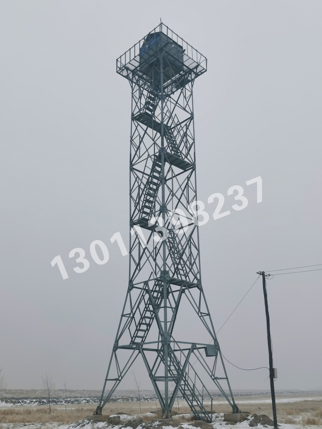 瞭望塔主要用于監管人員登塔高空瞭望監測使用,該塔由塔體、樓梯及瞭望崗亭組成。塔體附加安裝前端視頻采集設備、無線傳輸設備及風光供電設備,主要應用單位為國家邊海防委員會、林草局、公安等部門。該塔為通信塔應用的分支塔型。塔體樓梯執行標準02J401,樓梯踏步采用扁豆型花紋板(或鋼格板),兩側扶手采用鍍鋅鋼管、樓梯兩側扶手現場焊接后采用油漆防腐處理。塔頂平臺處設置瞭望崗亭(也叫塔房)、瞭望崗亭外形為四角型或者六角形,瞭望亭外部為塔頂平臺四周圍欄,崗亭采用彩鋼復合板或者雙層不銹鋼材料。樓梯進出室內部分設置出入口門鎖。